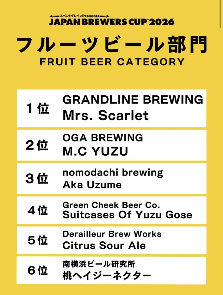 2026年2月6日(金)〜8日(日)に横浜大さん橋ホール開催中の「JAPAN BREWERS CUP 2026」のビール審査会における【フルーツビール部門(Fruit Beer category)】にて、弊ブルワリーの「Mrs. Scarlet」が出品数130ある中で頂点に立ちました!リリース前の新作にして、1位GOLD受賞の快挙達成です!!