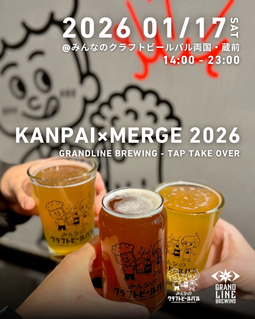Hello, Friends!この度、昨年も好評だったイベントが再来!GRANDLINE BREWING TAP TAKE OVER「KANPAI×MERGE 2026」をみんなのクラフトビールバルさんで実施させて頂くことになりました。